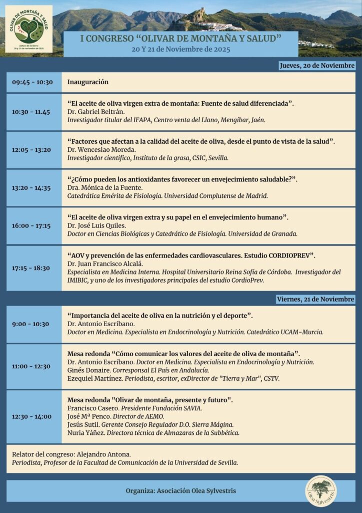 Los días 20 y 21 de Noviembre de 2025, celebramos en Zahara de la Sierra, pleno corazón de la Sierra de Cádiz, el I Congreso “Olivar de Montaña y Salud”, organizado por nuestra asociación Olea Sylvestris. Desde la asociación, queremos expresar nuestro más sincero agradecimiento a todas las personas e instituciones que han hecho posible el éxito de este primer Congreso sobre el olivar de montaña y sus beneficios saludables.